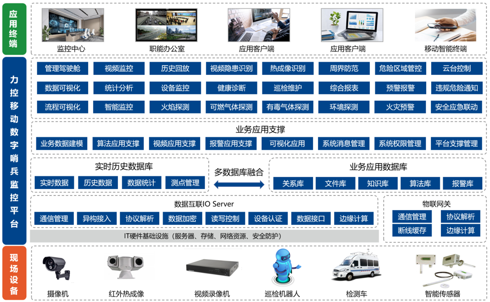 力控移動數字哨兵監控平臺支持探測裝置、智能傳感器、視頻圖像、安防報警以及各類工業設備統一接入管理,實現各維度數據統一展示分析,并結合算法模型實現AI識別、危險提醒、數據分析、預警等智能應用, 提高現場安全防范、智能運維能力,該平臺目前已廣泛應用于石油、化工、礦山、樓宇、變配電、交通、環保等領域。