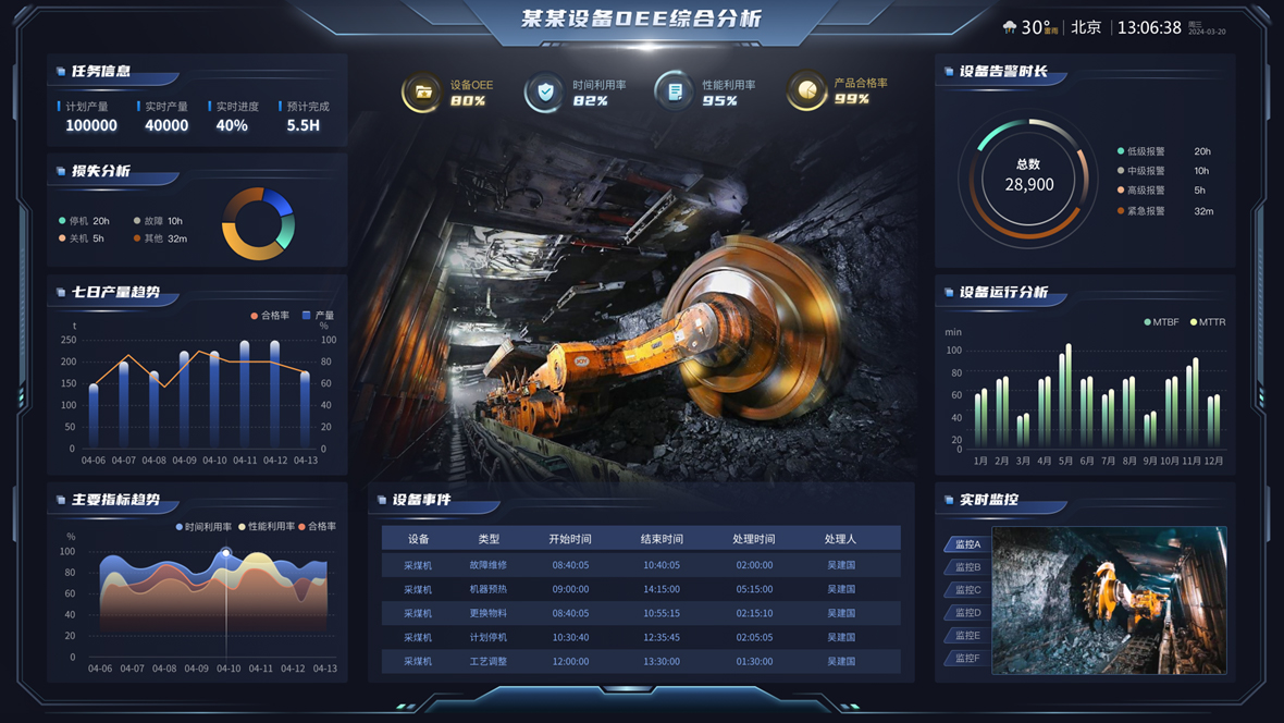 傳統SCADA系統側重設備的數據采集、監視控制和生產調度,缺乏對設備數據深層次的挖掘分析,無法直觀反饋設備運行效率和變化規律。通過設備OEE對力控SCADA系統進行擴展,對OEE中各項損失開展多維度可視化分析,發現生產過程中的瓶頸工序和運行損失,有的放矢的進行工藝和設備運行改善。