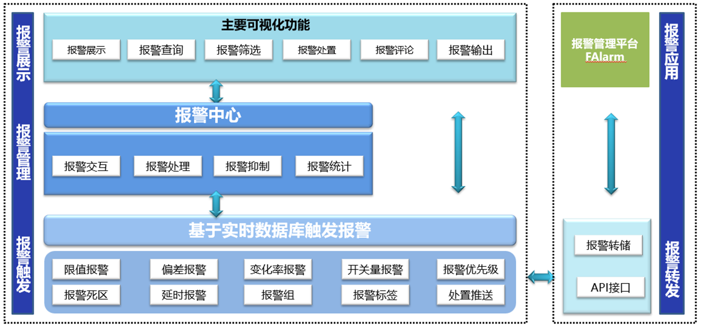 通過數(shù)據(jù)庫配置執(zhí)行、后臺處理、前端展示的模式確保報警觸發(fā)的實時性。報警多級別、多類型、多結構,以及多客戶端顯示/確認的設計便于客戶高效處理和篩選報警信息。