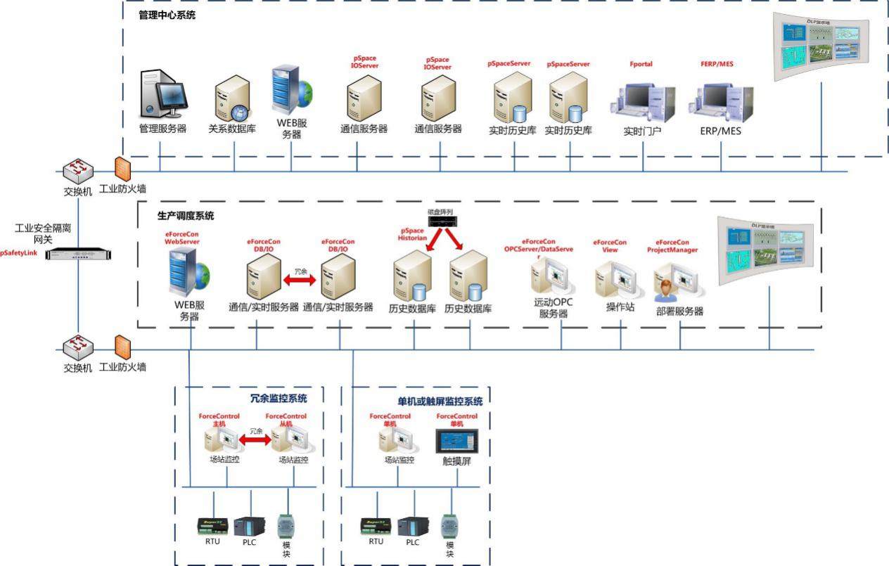 系統(tǒng)主要包括調(diào)生產(chǎn)現(xiàn)場(chǎng)監(jiān)控、生產(chǎn)調(diào)度系統(tǒng)、管理中心系統(tǒng)。生產(chǎn)現(xiàn)場(chǎng)監(jiān)控,需要配備場(chǎng)站監(jiān)控(冗余監(jiān)控系統(tǒng))和觸摸屏(單機(jī)或觸屏監(jiān)控系統(tǒng)),生產(chǎn)調(diào)度系統(tǒng)主要配備實(shí)時(shí)數(shù)據(jù)庫(kù)、歷史數(shù)據(jù)庫(kù)、遠(yuǎn)動(dòng)OPC服務(wù)器、操作員站及部署服務(wù)器等,管理中心系統(tǒng)主要配置企業(yè)級(jí)實(shí)時(shí)歷史數(shù)據(jù)庫(kù)和企業(yè)實(shí)時(shí)信息門(mén)戶;層級(jí)之間配備了隔離網(wǎng)關(guān)和防火墻等安全設(shè)備保證系統(tǒng)信息安全。