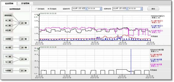 管理運行主要包含站間管線監(jiān)測以及井場管線監(jiān)測,主要以實時與歷史曲線方式體現(xiàn)。 站間管網(wǎng)曲線重點對各站點對點集輸或插輸管線的流量、壓力實時監(jiān)測,井場管線重點以井場回壓實時監(jiān)測。