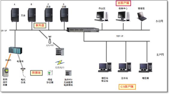 SCADA系統(tǒng)監(jiān)控中心以2臺冗余的服務器做為數(shù)據(jù)采集,由eForceCon歷史庫做為歷史數(shù)據(jù)備份服務器及WEB發(fā)布工作,至少配備2臺以上操作作員站(C/S客戶端)做為服務器的遠程部署及工藝流程處理工作,并具有控制泵與抽油機等設備的最高優(yōu)先級。在監(jiān)控中心的其它計算機或辦公區(qū)域計算機可直接通過IE瀏覽器訪問SCADA系統(tǒng)工程,并可根據(jù)分配的不同權限等級完成具體的監(jiān)控工作。