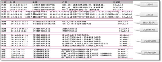 事件系統(tǒng)重點記錄整個SCADA系統(tǒng)的運行情況,在服務端與客戶端所記錄的內(nèi)容方式有所不同,分別為冗余服務器日志、歷史服務器日志、客戶端操作日志。