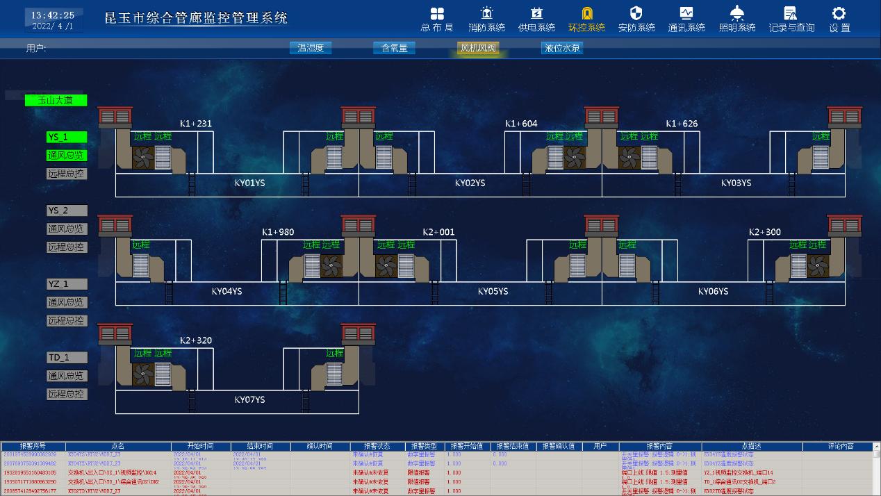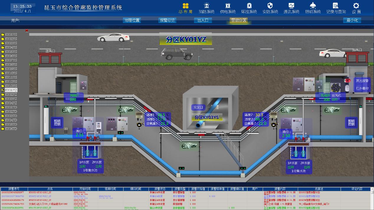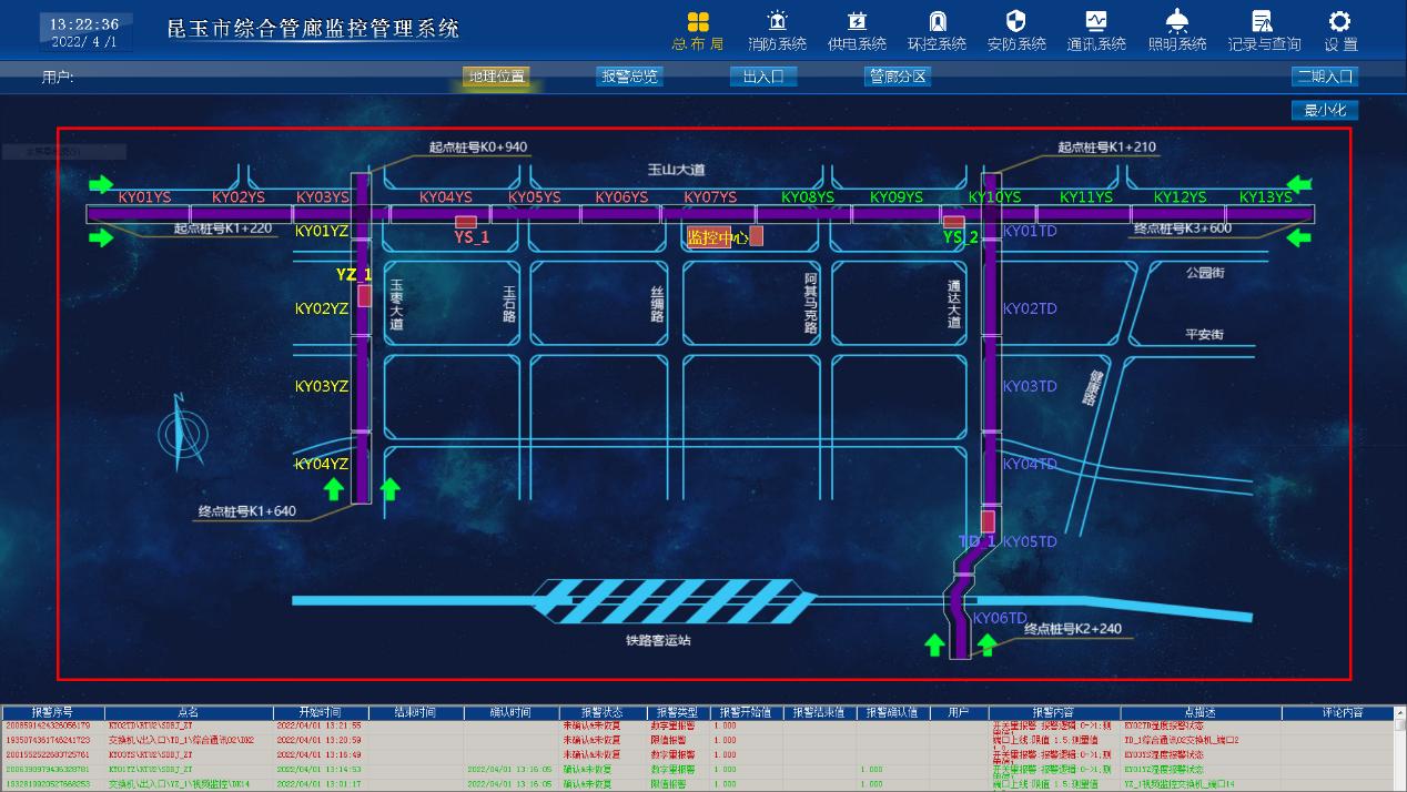 通過3D模型的方式展示綜合管廊監(jiān)控中心、防火分區(qū)、設(shè)備間地理分布圖和重要設(shè)備地理分布圖如管道閥門,在地圖上展示系統(tǒng)區(qū)域主要運(yùn)行信息,并顯示鼠標(biāo)靠近區(qū)域詳細(xì)運(yùn)行信息,單擊鼠標(biāo)切換對應(yīng)區(qū)域的詳細(xì)工藝畫面或功能畫面。 當(dāng)發(fā)生管道泄漏、非法入侵、發(fā)生火災(zāi)、設(shè)備運(yùn)行異常等報警時,系統(tǒng)迅速對報警發(fā)生的防火分區(qū)或設(shè)備間進(jìn)行定位,在地圖上對應(yīng)區(qū)域進(jìn)行警示性閃爍,同時結(jié)合報警聲音,提醒值班人員進(jìn)行報警處理。