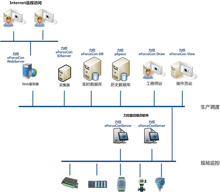 平臺采用分布式結構部署,支持B/S結構,可擴展C/S模式,與現(xiàn)場子系統(tǒng)可通過底層PLC驅動或者OPC無縫連接,以達到良好的實時性與可靠性。