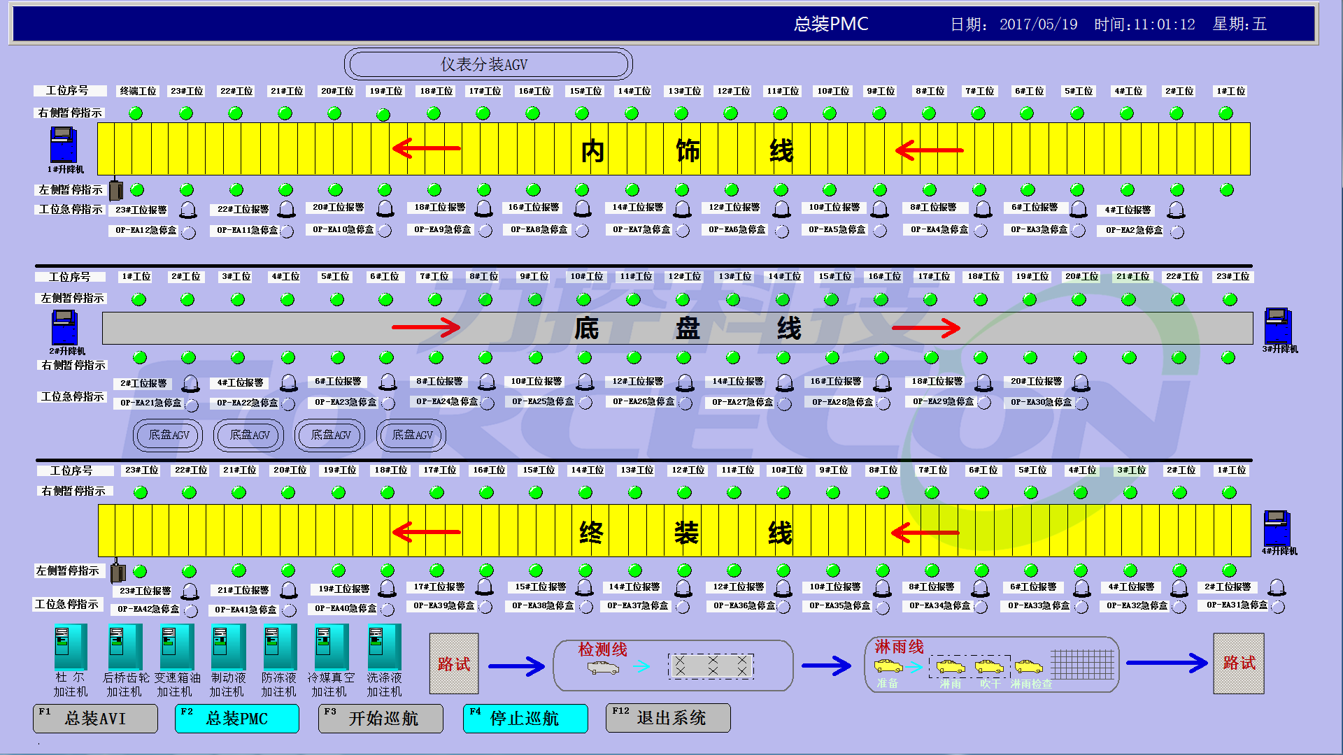 AVI車輛跟蹤實現對現場車輛數量及車輛信息(訂單編號,工單編號,物料編碼,物料名稱,VIN碼,顏色,工位,車型等)的實時信息采集在CCR中控平臺的展現實現車輛動態生產過程中的可視化,實時顯示AGV運行狀態信息、工位詳細車型信息等。