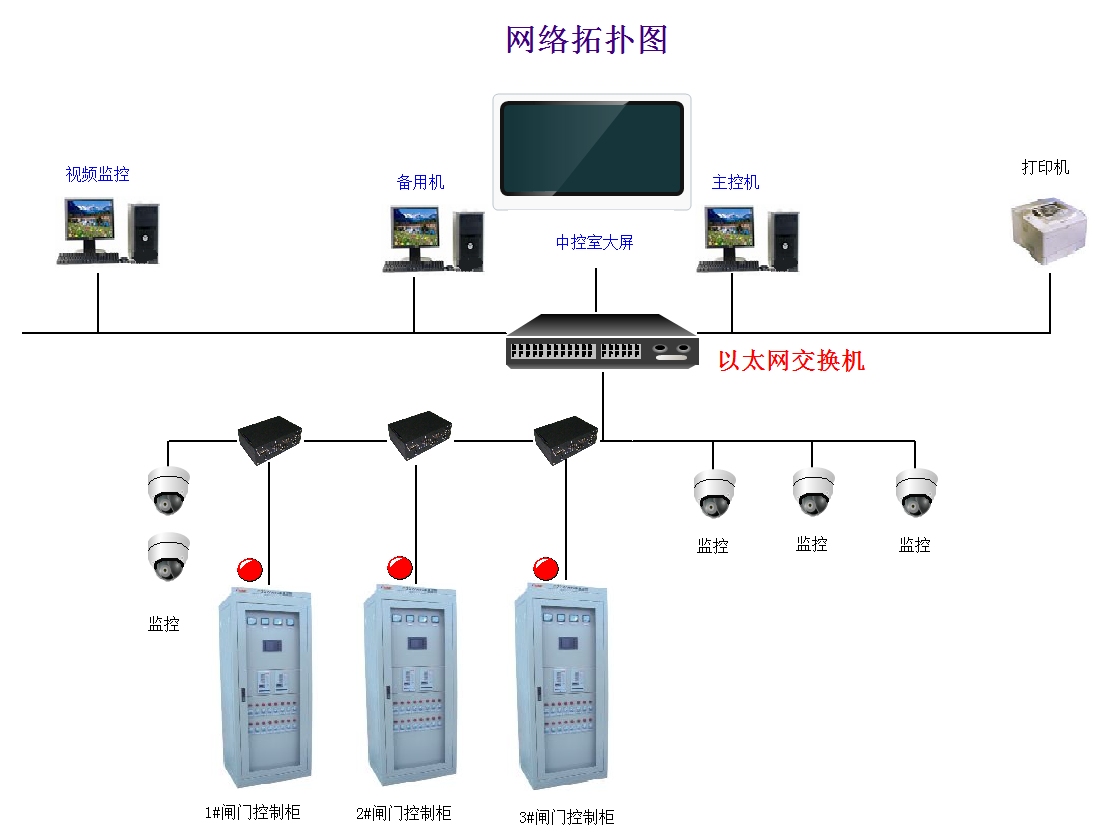 由閥門控制柜對水位進行控制,由監控設備對其進行監控,通過以太網交換機傳到中控室大屏,可以通過視頻監控查看實時情況,有兩個控制機,一個主控機和一個備用機,還有一個打印機。