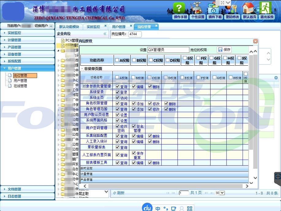 生產(chǎn)信息化系統(tǒng)平臺權(quán)限設(shè)置基本思想是根據(jù)客戶的人事組織架構(gòu),以崗位劃分為基礎(chǔ),對不同崗位的人員授予不同的權(quán)限,可以授權(quán)到具體某個人可以查看某廠區(qū)、工藝段的某工藝畫面和能源報表等,結(jié)合不同崗位人員關(guān)注方向,形成一人一看板。信息平臺的系統(tǒng)用戶登錄數(shù)量是不受限制的,即通過瀏覽器登錄信息平臺的用戶數(shù)量不做限制,具體到某一用戶的權(quán)限可以根據(jù)現(xiàn)實的需求做具體的授權(quán)。