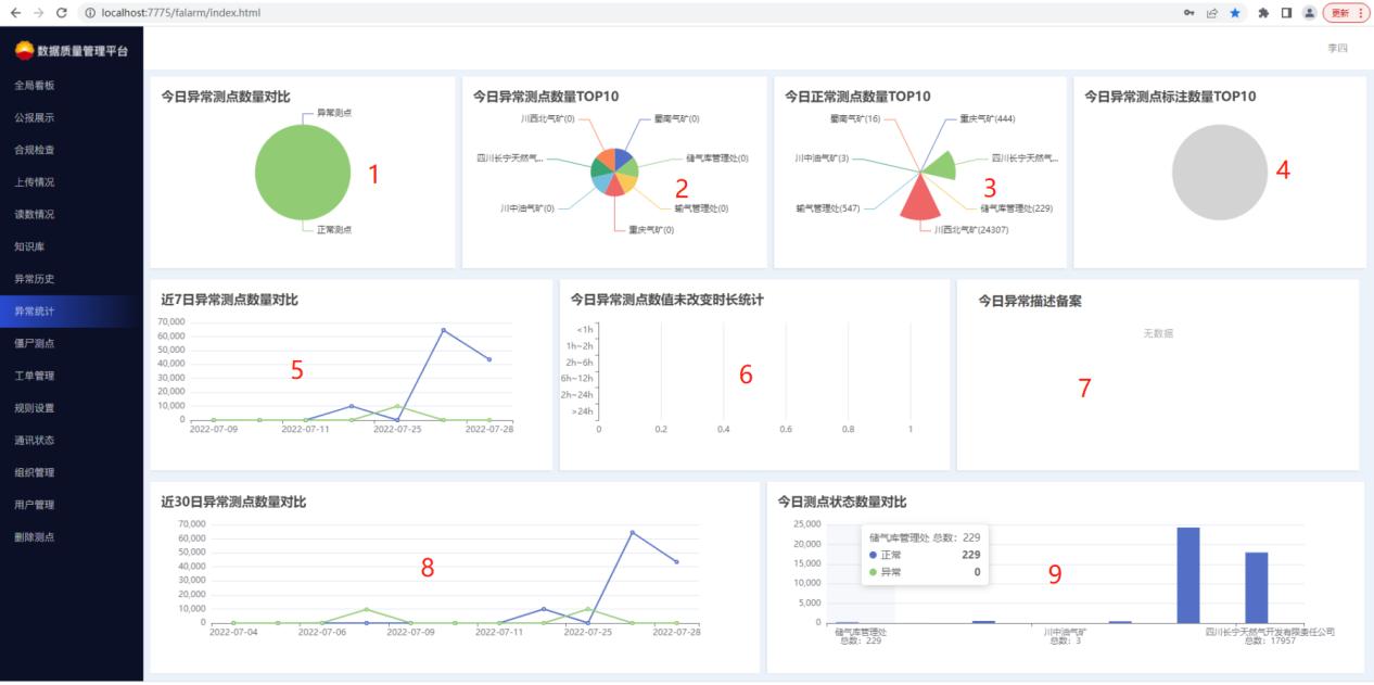 在異常統計中,總共分為9部分顯示,能清楚的顯示出我們數據庫異常測點的信息。不同權限的賬號登錄,只能看到自己權限下的測點。
