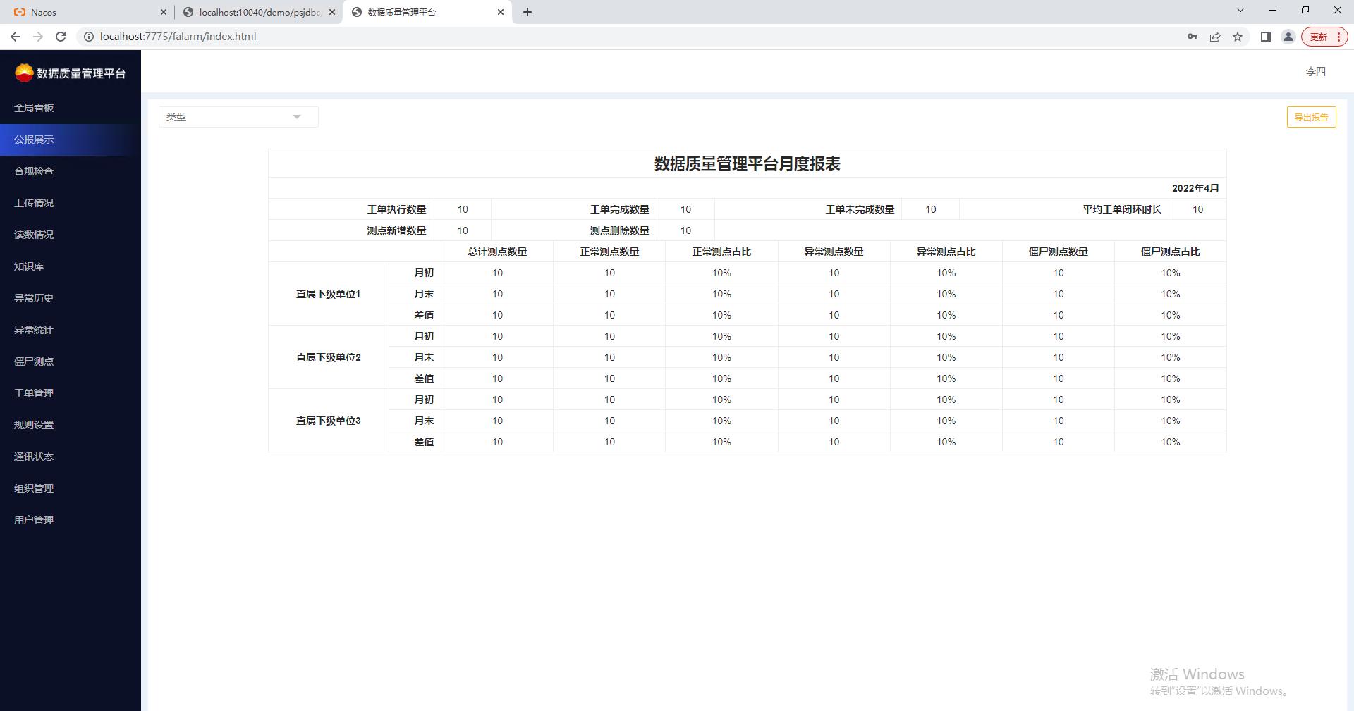 如果登錄的賬號權限是分公司賬號,那我們“直屬下級單位”顯示出分公司的下級單位的名稱,也就是二級單位的名稱,依次統計出二級單位的測點信息并顯示出來。如果我們登錄的賬號權限是二級單位賬號,那么“直屬下級單位”顯示出該二級單位下的三級單位,并將三級單位的測點信息展示出來。 左上角“類型”,可以根據需求選擇周報、月報、年報來顯示出報表。 右上角“導出報表”,將數據質量管理平臺報表按照PDF的形式導出文件。