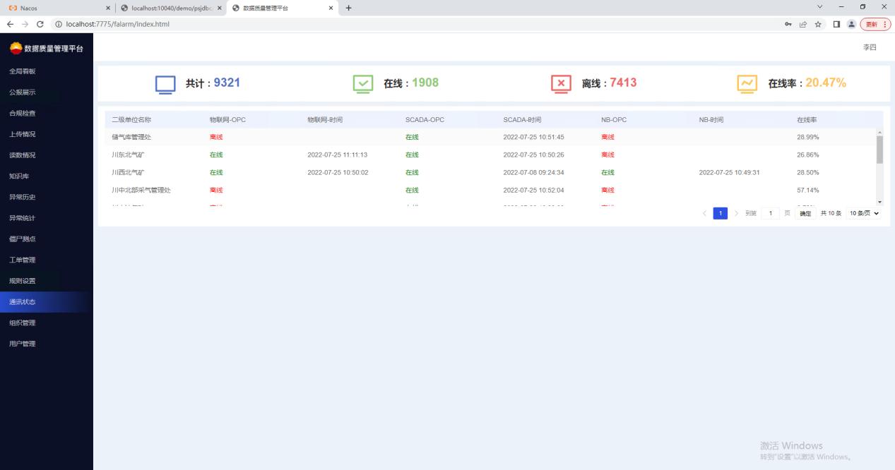 通訊狀態顯示數據庫下所有的設備的狀態,不通賬號顯示的設備不同。例如管理員可以顯示所有的設備,而二級單位只能顯示二級單位下的設備。