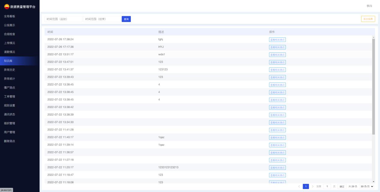 知識庫為“上傳情況”和“讀數情況”中異常測點備案的數據點,當我們使用“異常測點備案”時,所有備案的異常點都會顯示在“知識庫”中。