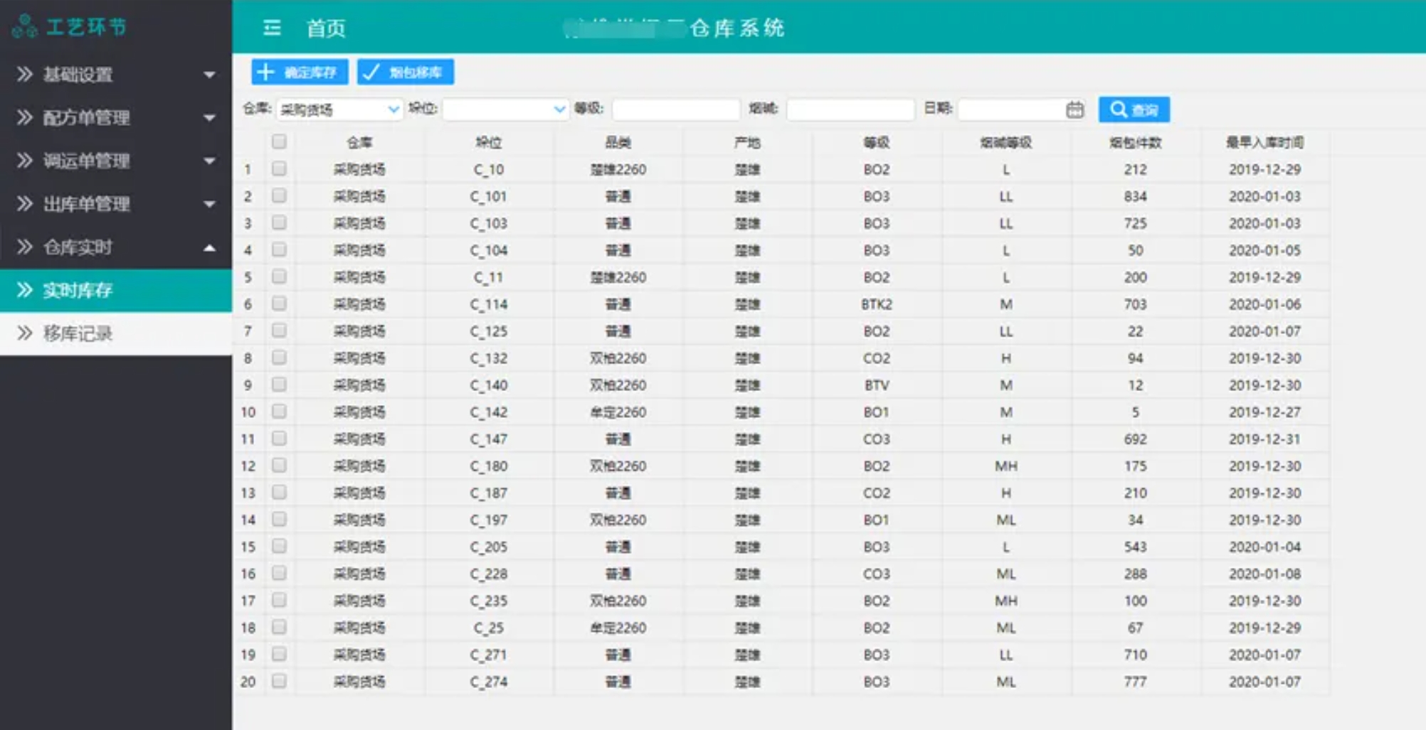 主要包含原煙分選、選葉檢驗(yàn)、分組縫包、煙包/煙框交接、煙包/煙框入庫(kù)、出庫(kù)管理、查詢庫(kù)存、移庫(kù)、備料投料等功能。