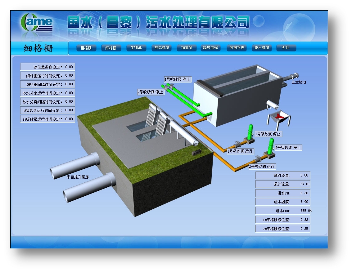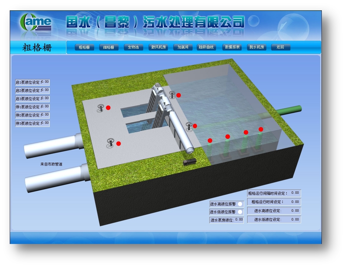 爬式粗格柵,進水經(jīng)過粗格柵間過濾一些大的固體雜質(zhì),去除那些可能對水泵有影響的無機物。需要監(jiān)測格柵水位差、進水流量、進水酸堿度、進水COD、提升泵狀態(tài)等參數(shù)。