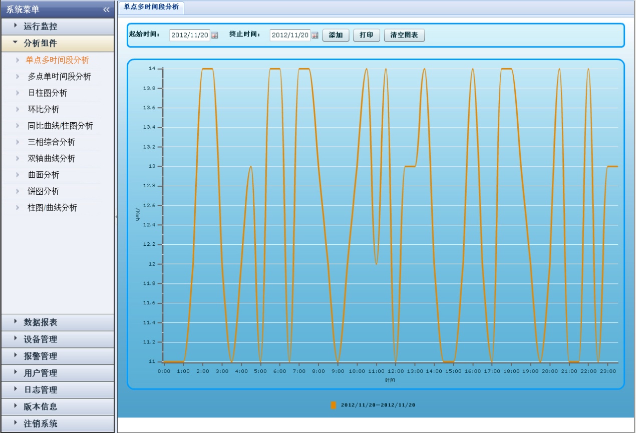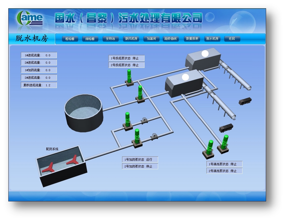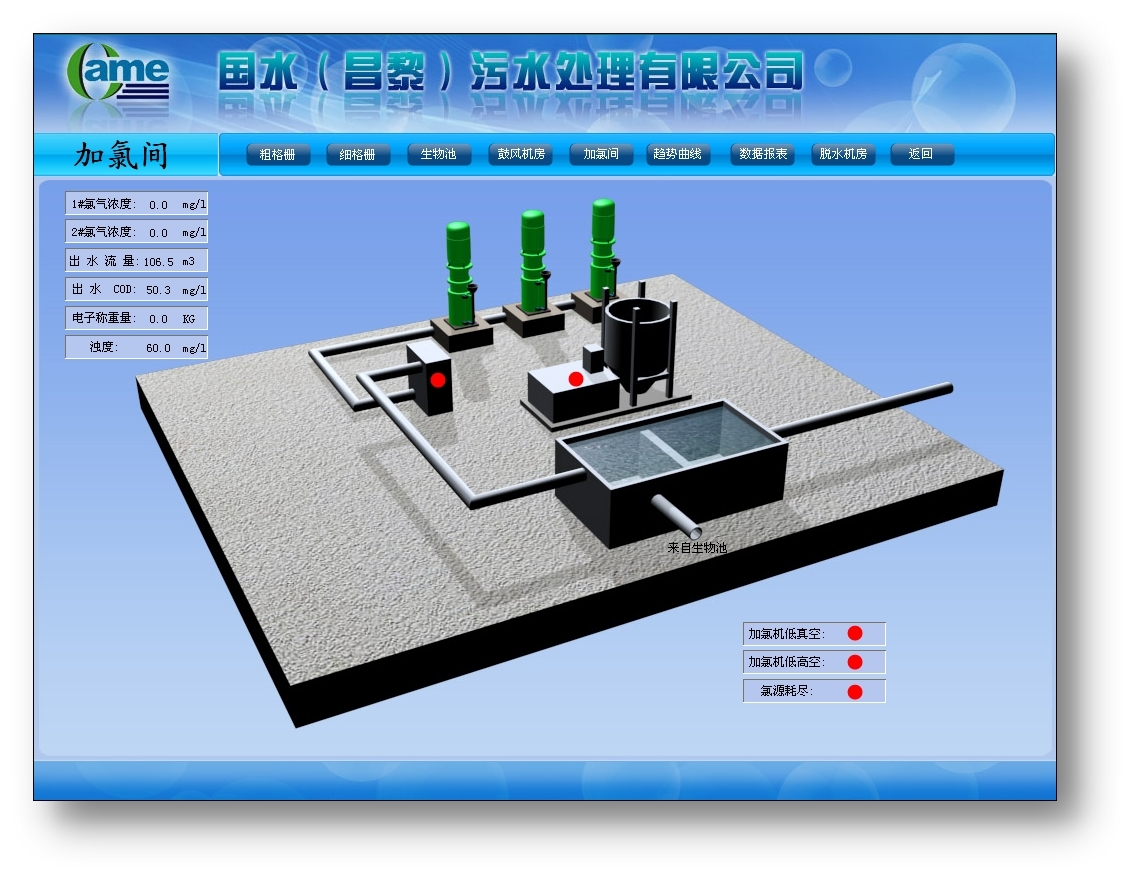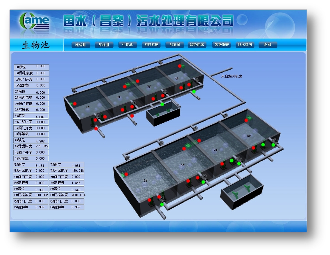 系統(tǒng)以美觀、友好的界面顯示設(shè)備運行狀態(tài)、流量、水位、COD、超聲波液位計、溶解氧計、氧化還原電位計、污泥濃度計、電磁流量計等數(shù)據(jù),并以仿真圖、直方圖、曲線圖和棒圖等多種方式清晰直觀地顯示各個敏感數(shù)據(jù),方便用戶對各敏感數(shù)據(jù)進行歷史查詢和對比分析。