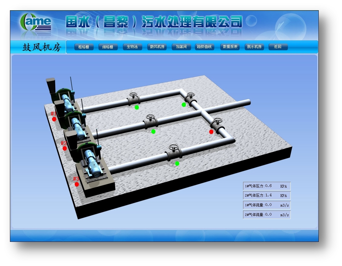 鼓風機房負責對反應(yīng)池進行鼓風曝氣,該鼓風機房設(shè)置3臺鼓風機,兩用一備。需要檢測閥門、鼓風機狀態(tài)等參數(shù)。