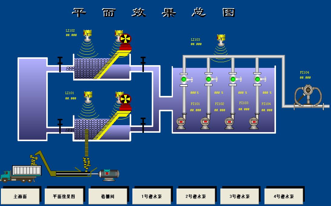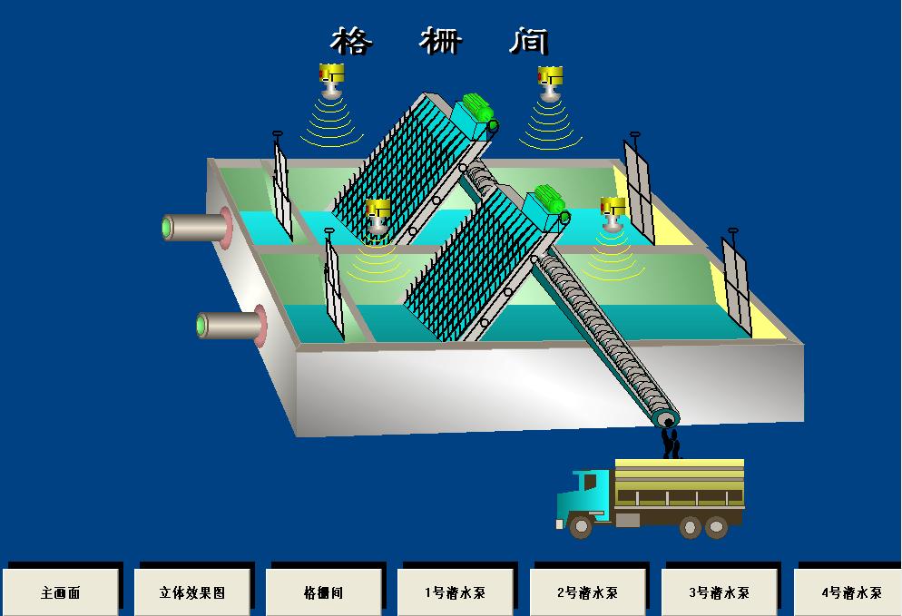 系統提供用于操作數據和非正常情況有效通訊的操作員界面。所有過程變量的數值和狀態,動態刷新。下圖是粗格柵及潛水泵房的立體和平面界面: