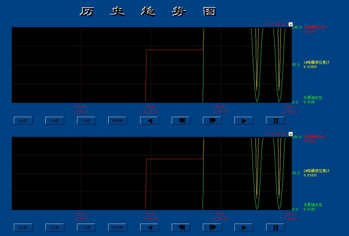 趨勢顯示包括歷史顯示和實時顯示等功能。趨勢顯示的形式,包括數字、棒圖顯示等多種實時或歷史的趨勢,直觀易看,供調度員分析比較,找出泵站的黃金運行規律和分析事故原因,改進管理方法。對于每一幅趨勢圖,操作員能對點的數量結合時間范圍進行在線組態,以及在線縮放趨勢曲線。系統提供滾動條用來使趨勢曲線在歷史記錄中向前或向后移動。單選某一個參數時,可以顯示該參數的全部信息以及實時趨勢和歷史趨勢。在同一趨勢圖上,可顯示至少二個變量的趨勢記錄曲線。
