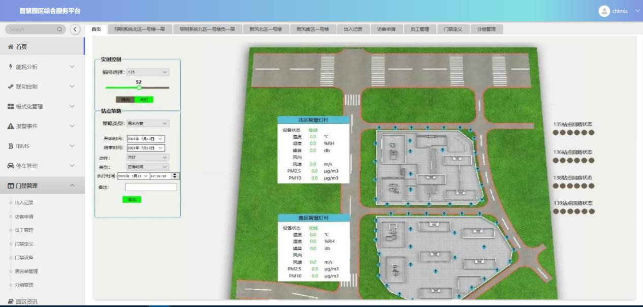 照明智能調(diào)節(jié):室外照明結(jié)合光感規(guī)則,綜管平臺(tái)根據(jù)日出日落時(shí)間自動(dòng)下發(fā)指令開(kāi)閉室外燈桿;室內(nèi)照明則在無(wú)訪(fǎng)客預(yù)約時(shí)段自動(dòng)關(guān)閉展廳燈光。