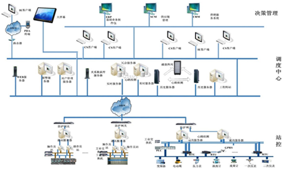 系統主要包括調度中心和站控系統。調度中心設置在企業的各級調度室,需要配備的硬件包括實時服務器(熱備冗余)、歷史服務器(熱備冗余)、磁盤陣列柜、Web服務器、視頻監控系統、工程師站、操作員站(根據監控站場數量調整)、視頻工作站、大屏顯示系統、打印機、UPS電源、網絡設備等;站控系統設置在各級場站,門站,主要配備的硬件有PLC系統、RTU系統、操作員站、通訊服務器等;層級之間配備了隔離網關等安全設備保證系統信息安全。