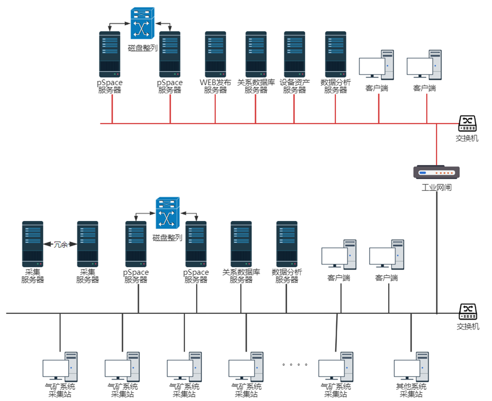 需要配備的硬件包括采集服務器(熱備冗余)、pSpace服務器、磁盤陣列柜、Web服務器、關系數據庫服務器、設備資產服務器、質量分析服務器、客戶端、大屏顯示系統、打印機、UPS電源、網絡設備等;生產網和辦公網之間使用工業網閘進行單向隔離,確保生產網安全。