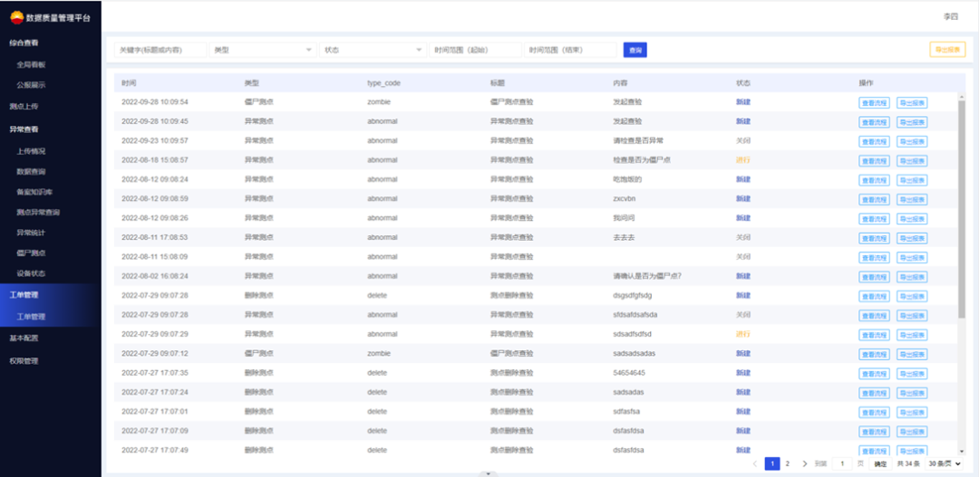 力控質量分析系統可對公司pSpace數據庫內部測點進行數據質量分析,包括測點合規性檢查、數據異常檢查、僵尸點篩查、通訊狀態統計、處理工單等功能。