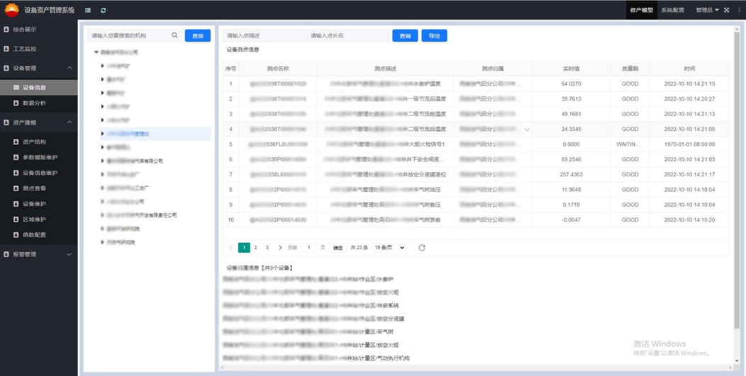 設備資產服務器部署力控設備資產系統,對公司各重點設備資產進行管理,用戶可自行選擇設備展示實時生產數據及靜態數據,按氣礦層級結果查看某場站某設備當前運行情況及設備臺賬信息。