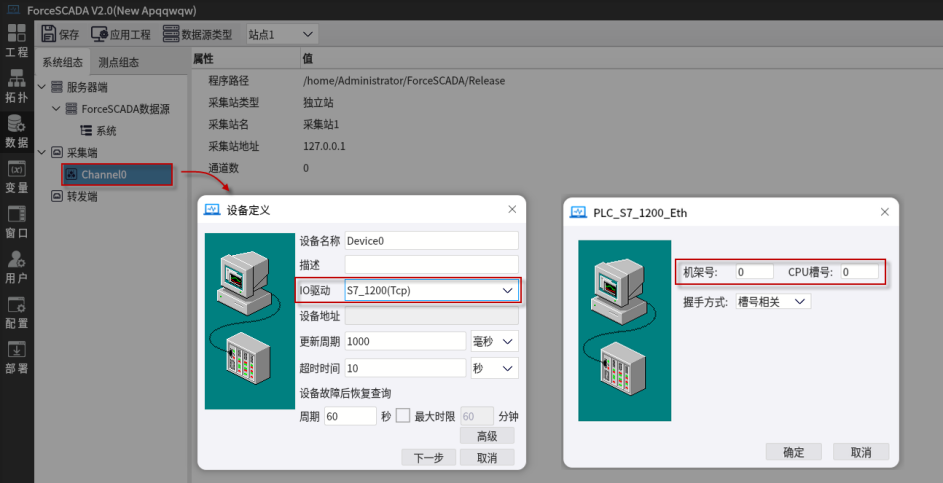 右擊通道-新建設(shè)備-IO驅(qū)動(dòng)(S7-1200TCP)-機(jī)架號(hào)和CPU槽號(hào)(根據(jù)設(shè)備填寫(xiě))