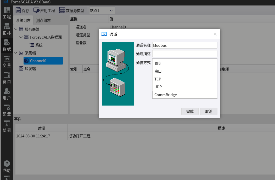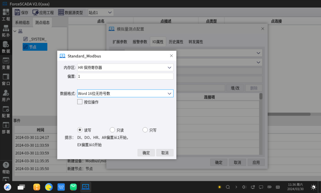 Modbus協(xié)議作為一種廣泛應(yīng)用的通信協(xié)議,F(xiàn)orceSCADA軟件平臺(tái)能夠與各種支持Modbus協(xié)議的工業(yè)設(shè)備進(jìn)行通信,簡(jiǎn)單的配置使客戶實(shí)現(xiàn)了對(duì)于數(shù)據(jù)的交互和設(shè)備的控制。
