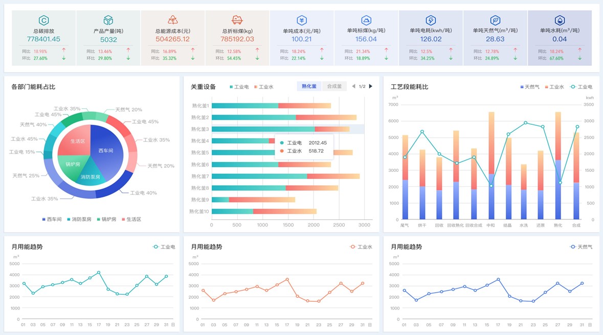 平臺(tái)結(jié)合用能指標(biāo)、報(bào)警策略,實(shí)現(xiàn)能耗超標(biāo)智能報(bào)警。根據(jù)能耗實(shí)時(shí)監(jiān)測(cè)、變化趨勢(shì)、產(chǎn)量、生產(chǎn)計(jì)劃,預(yù)測(cè)企業(yè)用能負(fù)荷、未來(lái)消耗量。結(jié)合折標(biāo)系數(shù)、碳排放系數(shù),實(shí)現(xiàn)標(biāo)準(zhǔn)煤轉(zhuǎn)換、碳中和管理。