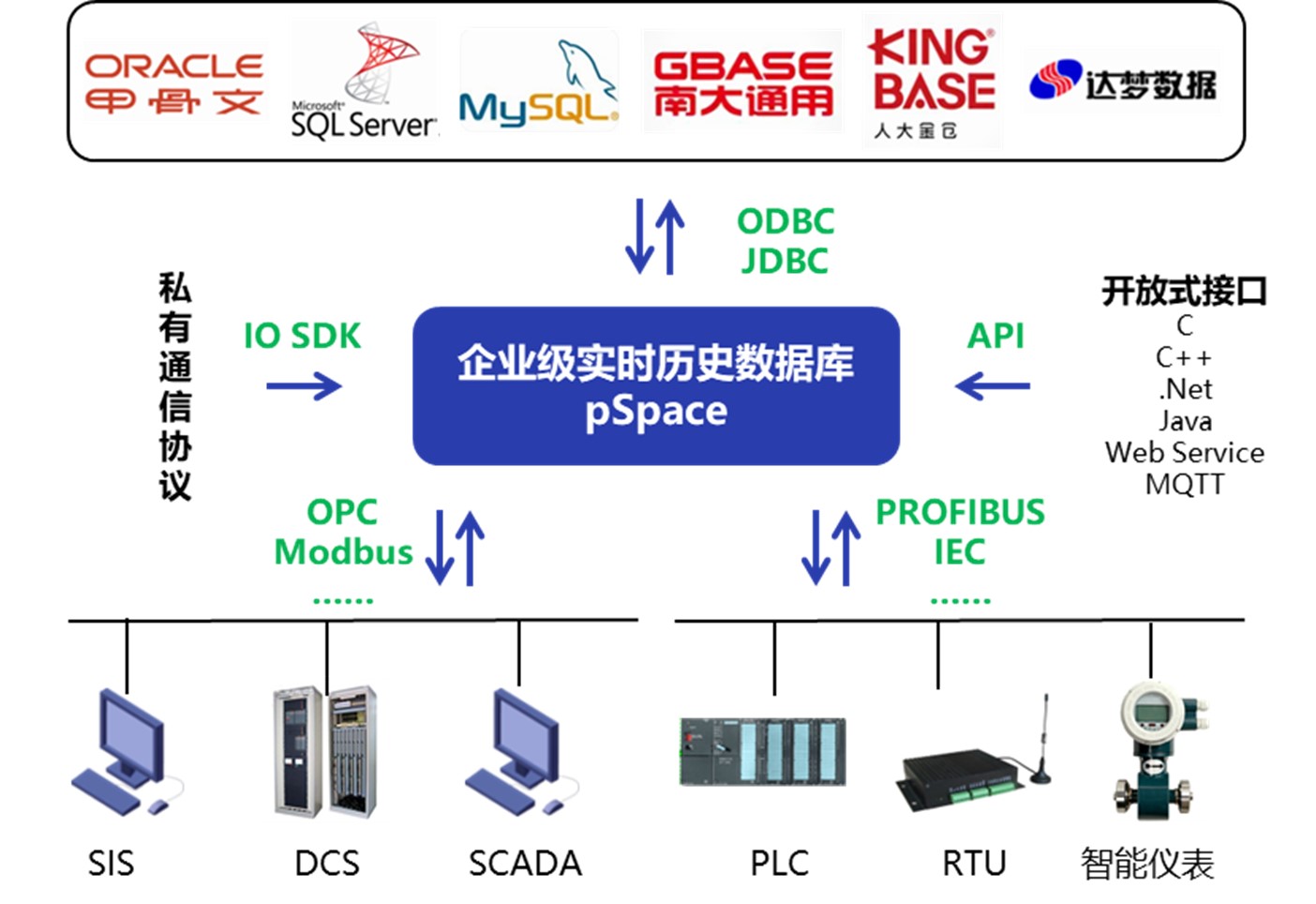 力控企業(yè)級實時歷史數(shù)據(jù)庫pSpace憑借獨特的“接口矩陣”技術,實現(xiàn)了與PLC、DCS、儀器儀表等端設備的向下連接,以及與大數(shù)據(jù)平臺等云端軟件的向上接入,從而提供系統(tǒng)互聯(lián)的全方位覆蓋和數(shù)據(jù)的無縫共享與協(xié)同。
