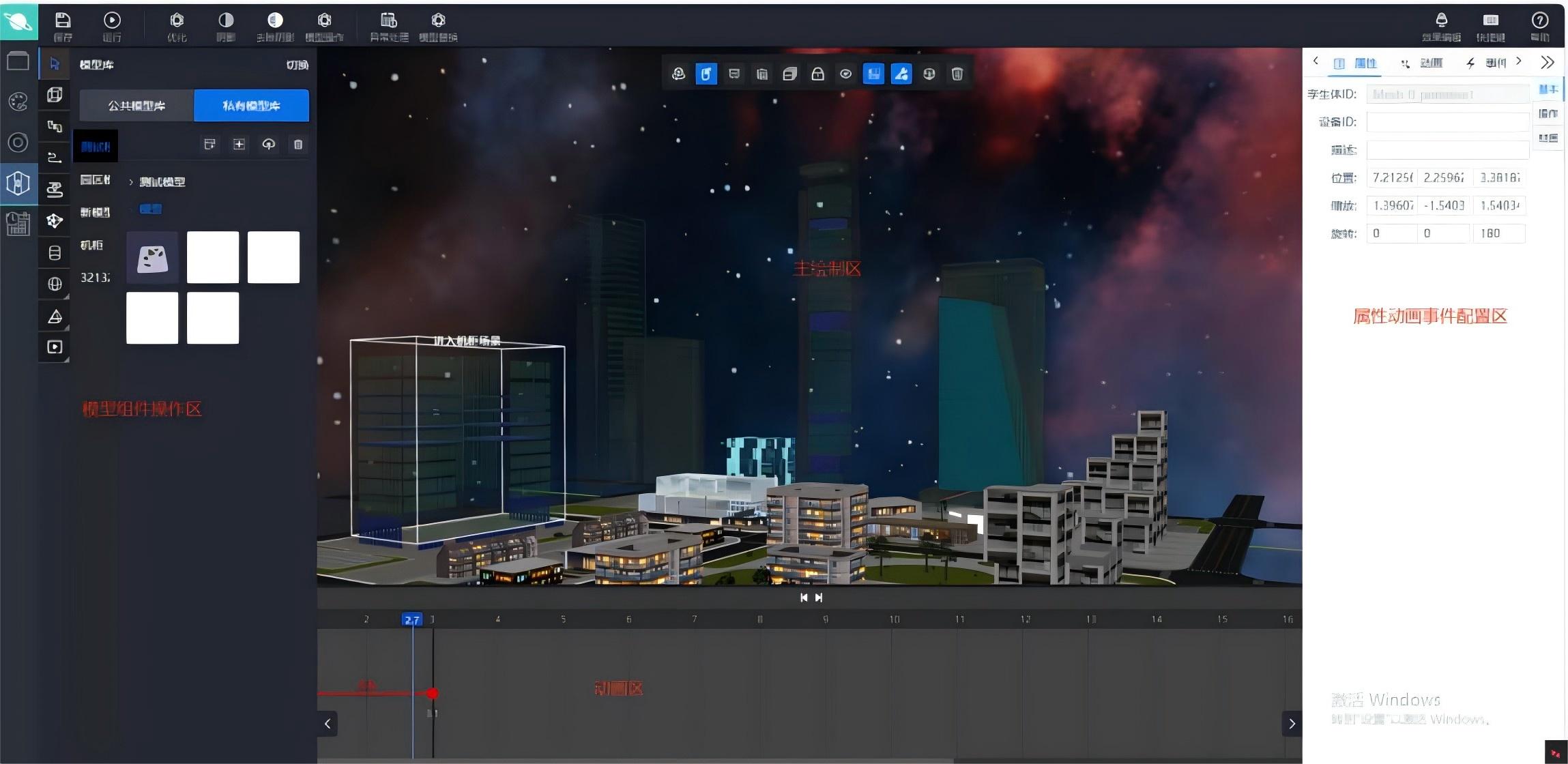 系統(tǒng)支持模型導(dǎo)入(如 gltf、glb、obj 等通用格式)與原生 3D 圖元繪制兩種建模方式,靈活適配不同項目需求。通過光源、相機、地面、天空盒等環(huán)境要素配置,結(jié)合動畫邏輯與腳本控制,高度還原真實工業(yè)環(huán)境。支持多場景自由切換,助力用戶高效構(gòu)建覆蓋全廠、車間、產(chǎn)線的智慧化三維場景。
