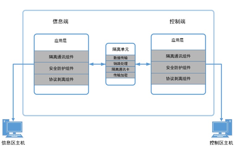 “2+1”隔離技術(shù)架構(gòu)由兩個獨立主機系統(tǒng)組成,一端的主機系統(tǒng)為控制端,用于連接控制網(wǎng)絡(luò)。另一端的主機系統(tǒng)為信息端,用于連接信息網(wǎng)絡(luò)。兩端主機均采用高性能嵌入式硬件,主板上各有多個以太網(wǎng)接口用來連接要隔離的兩個網(wǎng)絡(luò),兩端主機通過隔離裝置進行連接,保證數(shù)據(jù)交互的安全性。
