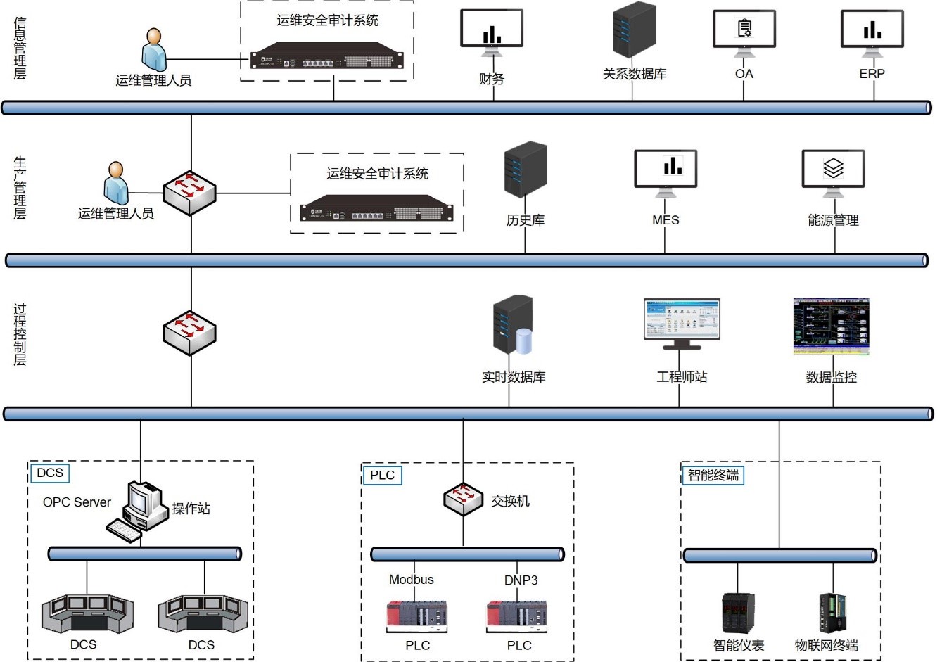 在信息管理層和生產(chǎn)管理層部署堡壘機(jī),對(duì)服務(wù)器、網(wǎng)絡(luò)設(shè)備、安全設(shè)備進(jìn)行日常操作與運(yùn)維的安全防護(hù),使用數(shù)字證書作為數(shù)據(jù)庫(kù)系統(tǒng)身份認(rèn)證方式。強(qiáng)制規(guī)定密碼復(fù)雜度規(guī)則、密碼有效時(shí)限、密碼長(zhǎng)度、密碼嘗試次數(shù)、密碼鎖定等。僅設(shè)置一位管理員具備系統(tǒng)權(quán)限,其余數(shù)據(jù)庫(kù)賬號(hào)僅授予能夠滿足使用需求的最小權(quán)限。堡壘機(jī)扮演著看門者的職責(zé),所有對(duì)網(wǎng)絡(luò)設(shè)備和服務(wù)器的請(qǐng)求都要從這扇大門經(jīng)過。因此安全管理與審計(jì)系統(tǒng)能夠攔截非法訪問和惡意攻擊,對(duì)不合法命令進(jìn)行阻斷、過濾掉所有對(duì)目標(biāo)設(shè)備的非法訪問行為并記錄詳細(xì)信息。堡壘機(jī)具備輸入輸出審計(jì)功能,不僅能夠詳細(xì)記錄用戶操作的每一條指令,而且能夠?qū)⑺械妮敵鲂畔⑷坑涗浵聛?lái);具備審計(jì)回放功能,能夠模擬用戶的在線操作過程,豐富和完善了網(wǎng)絡(luò)的審計(jì)功能。安全管理與審計(jì)系統(tǒng)能夠在自身記錄審計(jì)信息的同時(shí)在外部某臺(tái)計(jì)算機(jī)上做存儲(chǔ)備份,可以極大增強(qiáng)審計(jì)信息的安全性,保證審計(jì)人員有據(jù)可查。系統(tǒng)管理員可以通過多種查詢條件查看審計(jì)信息。堡壘機(jī)保護(hù)單位內(nèi)部網(wǎng)絡(luò)設(shè)備及服務(wù)器資源的安全性,使得單位內(nèi)部網(wǎng)絡(luò)管理合理化和專業(yè)化。