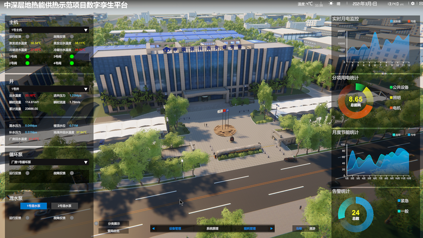 本軟件通過對中煤科工西安研究院地熱供暖泵房、主辦公樓及周邊輔助建筑物的供暖制冷需求搭建高精度1:1三維模型和工藝數(shù)學(xué)模型,通過三維可視化監(jiān)控界面實現(xiàn)主要供暖、制冷區(qū)域的溫濕度監(jiān)測,及泵房主要設(shè)備溫度、流量、壓力等運行參數(shù)監(jiān)控;結(jié)合工藝數(shù)學(xué)模型仿真計算結(jié)果、提供運行控制參數(shù)合理化建議;整個系統(tǒng)具備歷史數(shù)據(jù)查詢、分析、能耗管理、仿真培訓(xùn)、設(shè)備運行參數(shù)優(yōu)化等功能,該項目的成功實施起到了推廣數(shù)字孿生平臺應(yīng)用、促進兩化融合的先進示范效應(yīng)。
