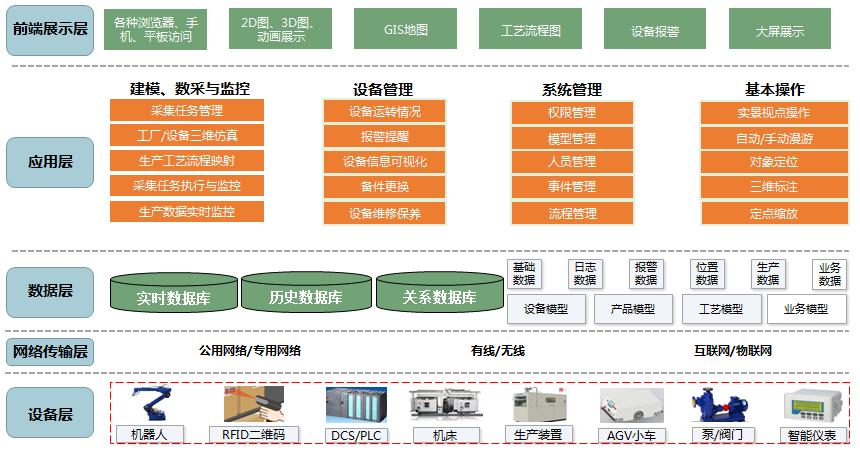 ● 三維可視化。通過構建物理實體三維幾何模型,為各個場景如園區、建筑物、生產車間、生產設備、監控設備等幾何模型添加信息屬性,并與相應位置IOT數據結合,實現云端三維可視化。