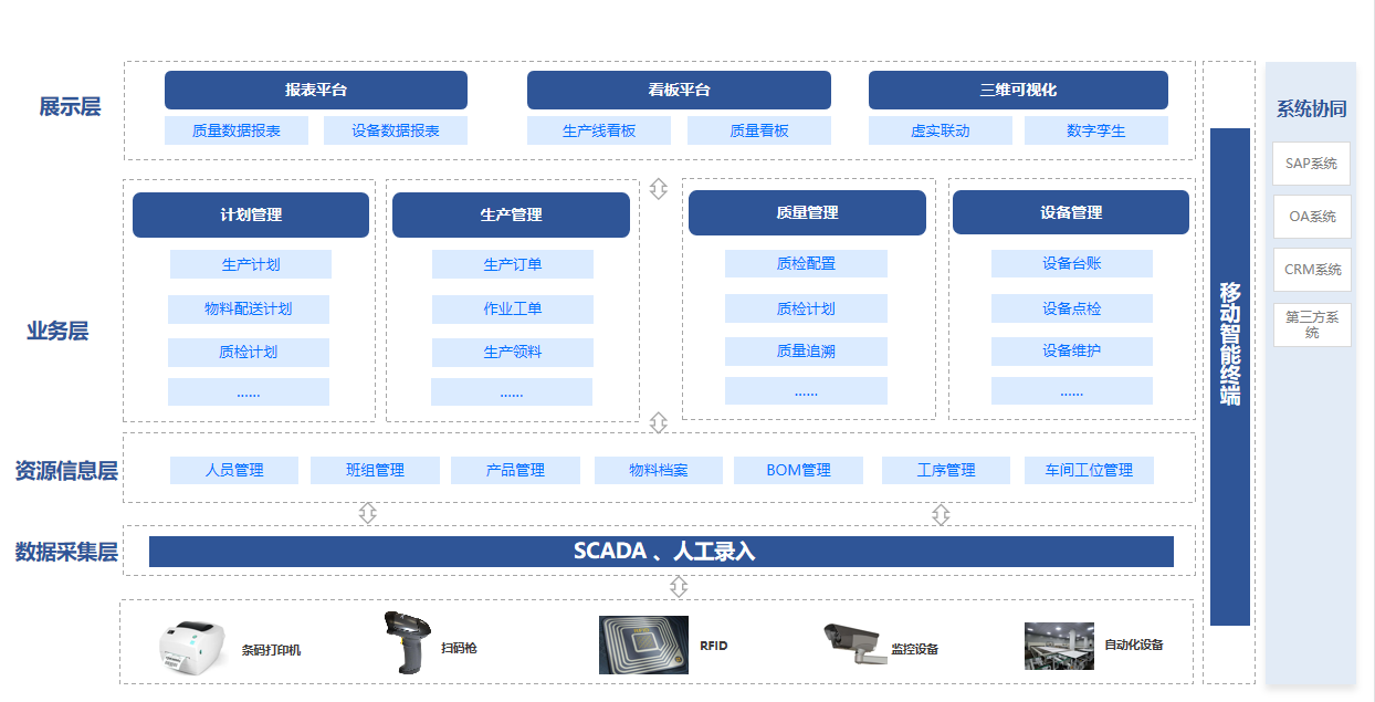 通過對(duì)工廠數(shù)據(jù)進(jìn)行集中的收集、分析和統(tǒng)計(jì),為企業(yè)提供各種可視化管理報(bào)表和看板,運(yùn)用工業(yè)平板、手機(jī)、PDA等移動(dòng)端遠(yuǎn)程操作和查看,真正實(shí)現(xiàn)線上的智能化工廠管理。