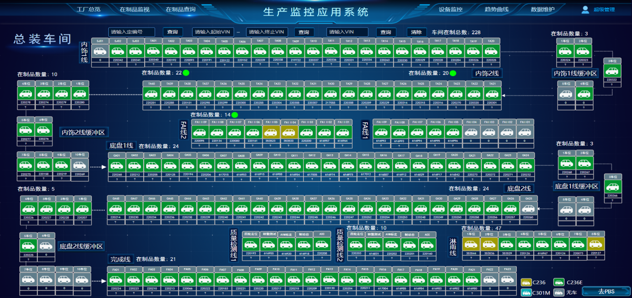 基于GIS位置的一圖可視化追蹤及查詢,可以直觀呈現在制品的當前工位、工位狀態、產品車型、車輛VIN、質量狀態等信息,幫助管理者快速了解生產現場情況,并做出相應決策,實現及時預警,提高流轉效率。