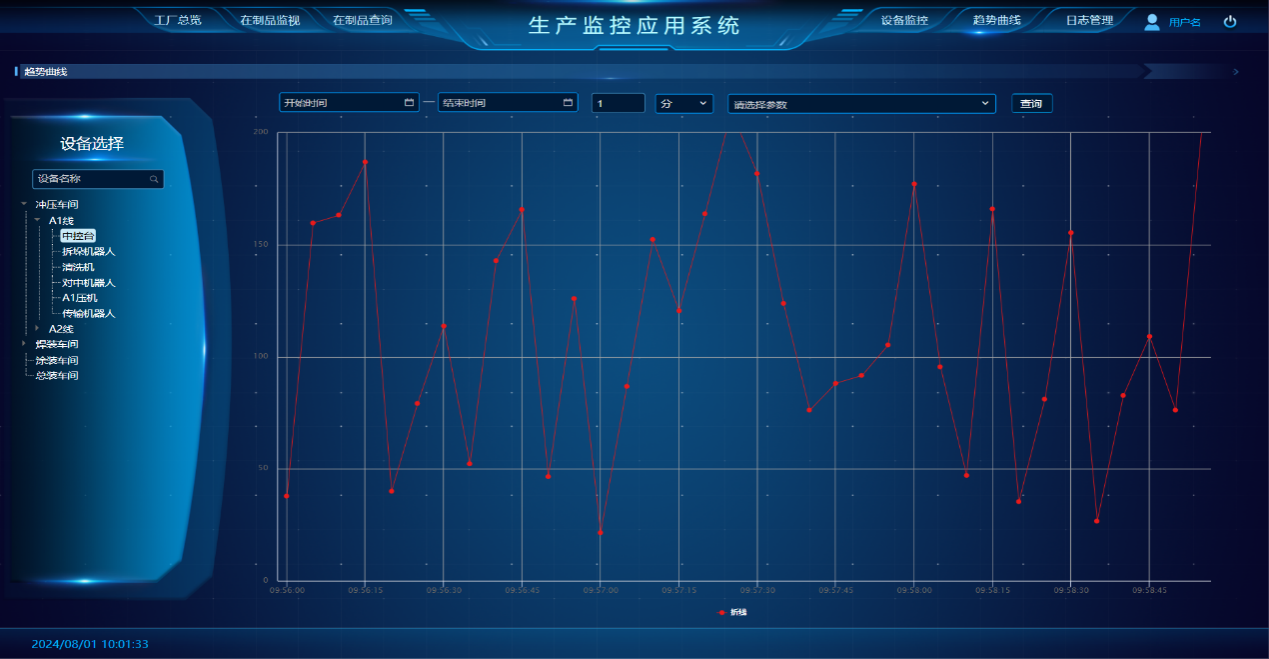 按照車間、產線、設備等分類形成趨勢曲線,可查詢車間設備模擬量參數(如流量、溫度、壓力、液位等)的變化趨勢。