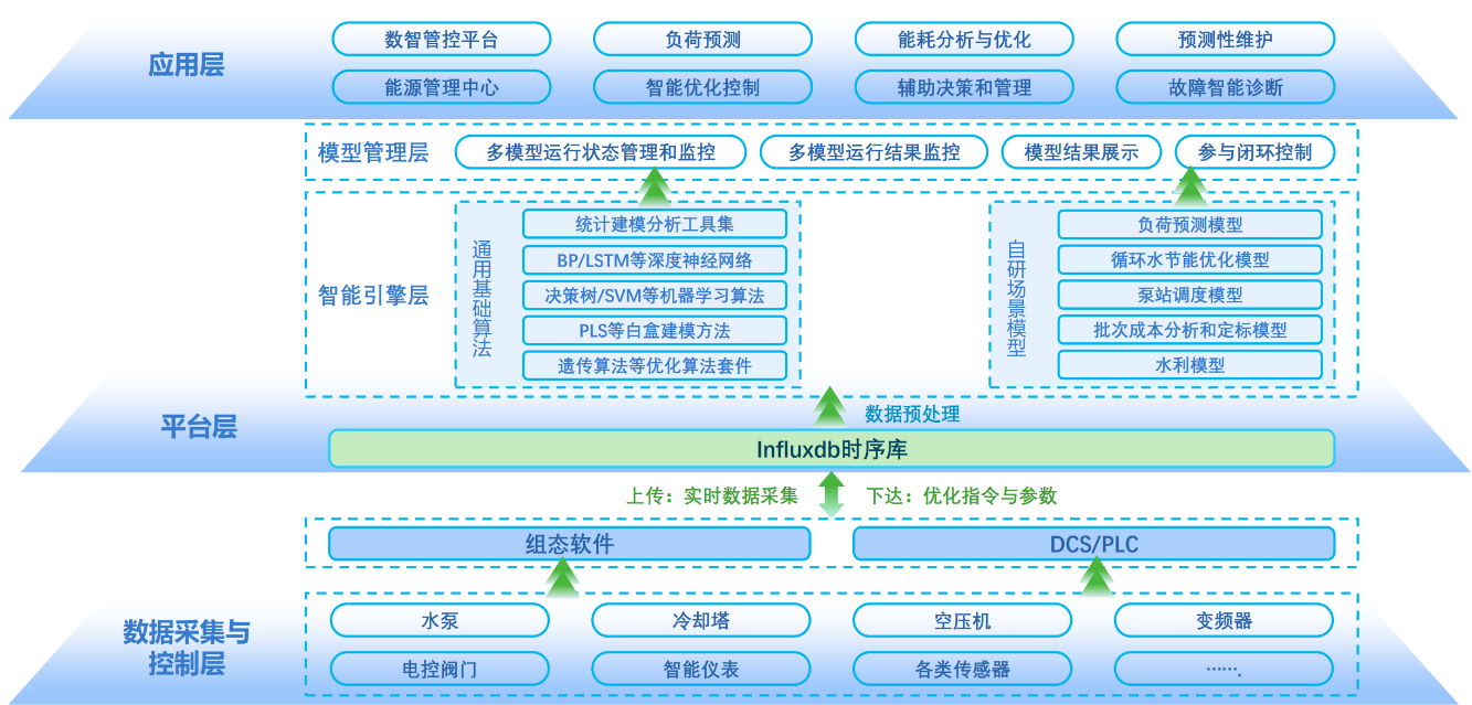 力控泵站AI節能優化調控系統方案結合水泵理論知識、工業AI技術和互聯網技術,基于實際工況運行數據以及分級調度規劃,建立泵組效能模型和泵站調度模型,實現水泵群精準優化調控和最優能效,從而實現泵房高效及安全運行,助力企業實現節能降耗、向資源節約型經濟轉型升級: